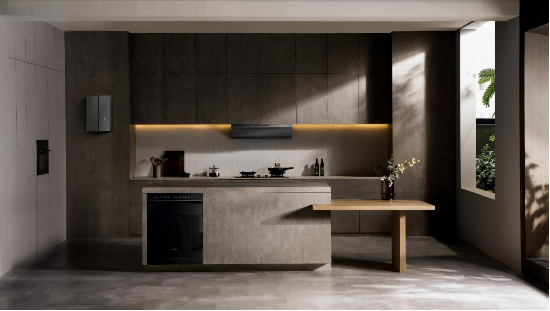 线下款快拢吸超薄烟机E6076Z则以“超薄零嵌真齐平”的设计,重新定义了吸油烟机与厨房橱柜的空间关系。仅350mm的超薄机身厚度,精准契合标准橱柜尺寸,实现了“0缝真齐平”的嵌入式安装效果,不仅避免了传统烟机突出橱柜的突兀感,更有效利用了厨房空间,让整体厨居环境更显简约精致。